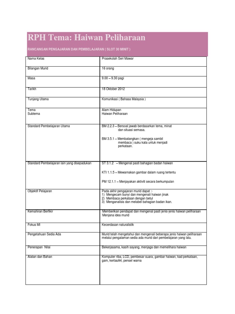 Rph tema haiwan rancangan pengajaran dan pembelajaran slot 30 minit nama kelas. 945 pagi - 1030 pagi 45 minit.